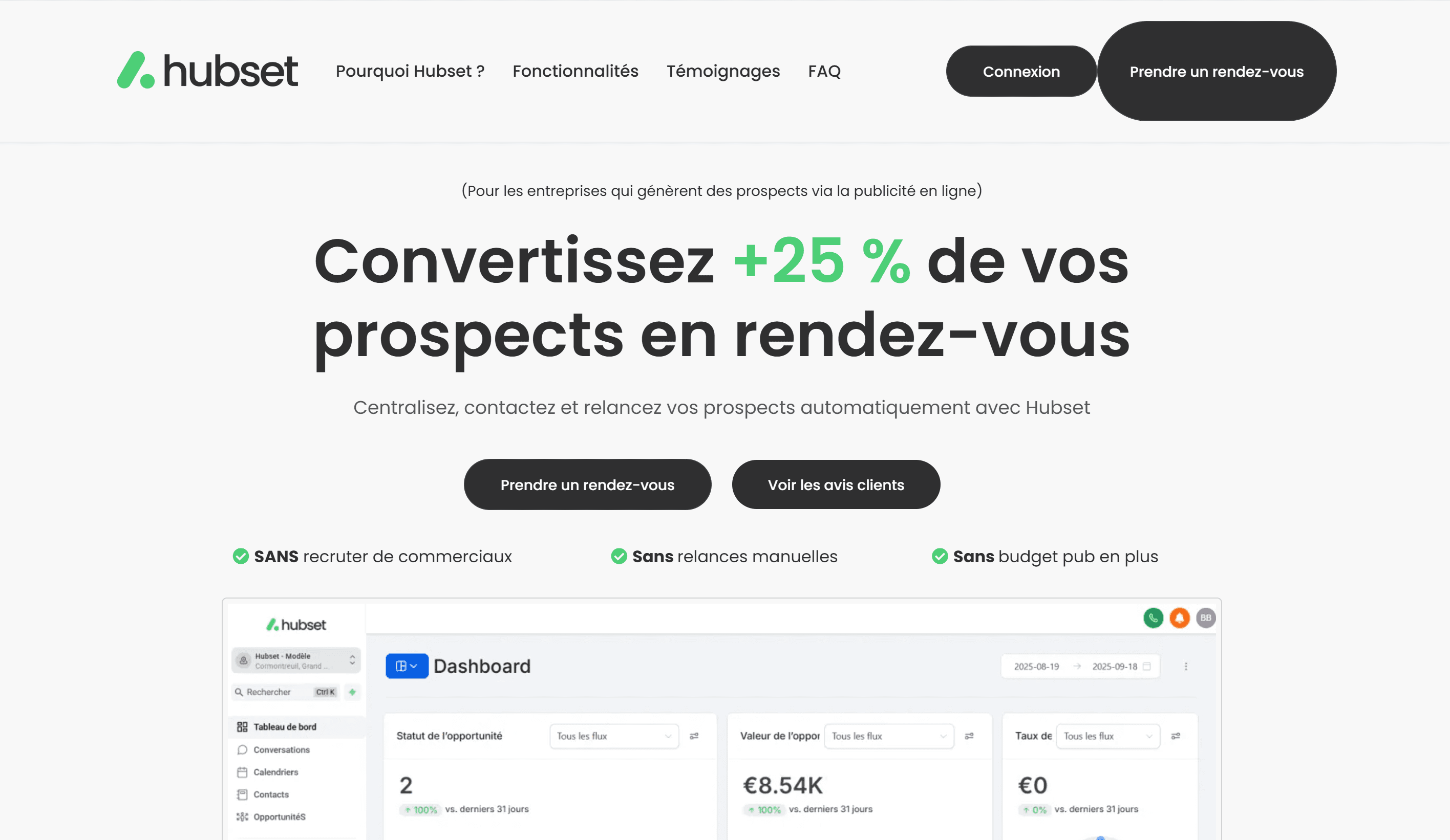 Proposition de valeur claire, CTA visibles et parcours net. Les prises de rendez-vous augmentent et les échanges sont plus qualifiés