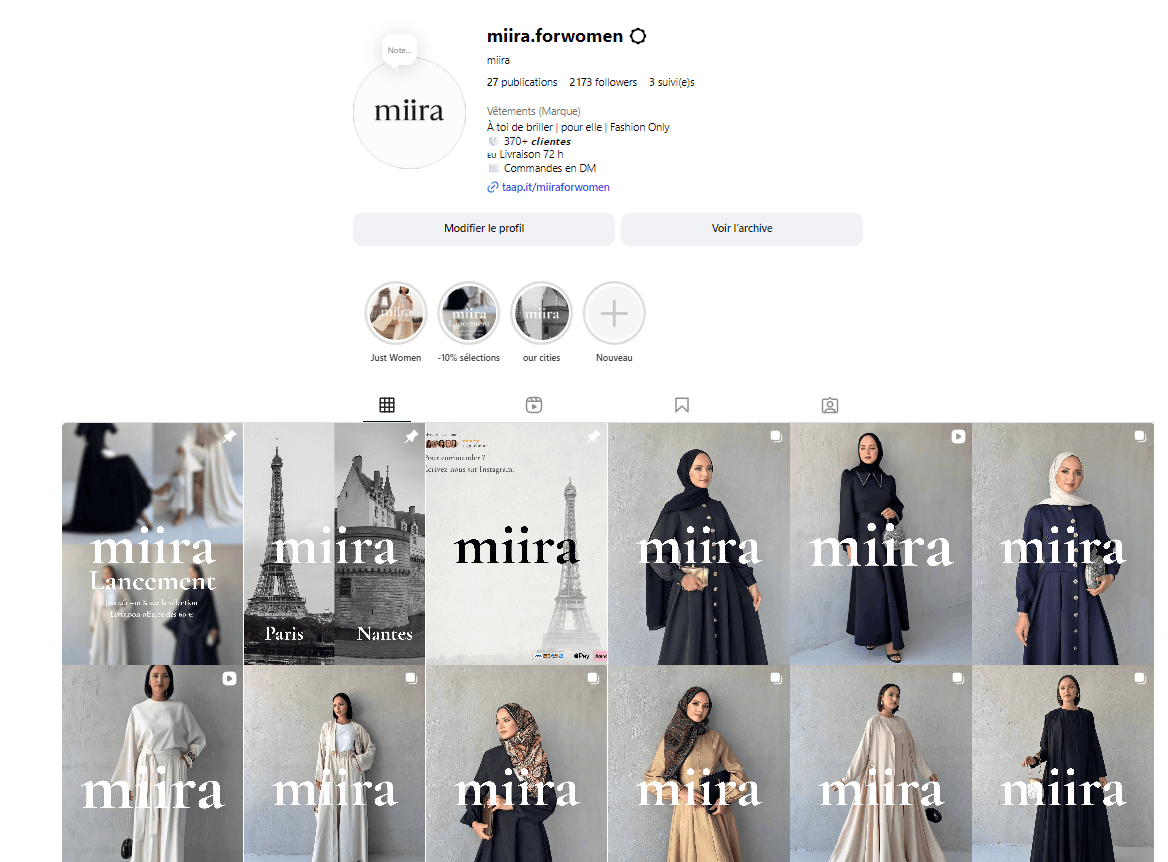 Miira est une marque de prêt-à-porter pour femmes qui célèbre une élégance contemporaine, sobre et authentique. Notre mission : poser des bases solides, lisibles et vendeuses. Nous avons conçu la boutique e-commerce (architecture des pages, UX claire, parcours d’achat rapide), défini une direction artistique douce et cohérente (palette neutre, typographies éditoriales, lumière naturelle), et écrit les fondamentaux de la marque (ton, messages clés, bénéfices). Côté produit, nous avons structuré la grille et les fiches (photos en situation, détail matière, guide des tailles, variations couleur/taille, éléments de preuve sociale) pour réduire les frictions et augmenter la confiance. Nous avons également cadré le rythme éditorial (lancements, capsules, “just women”), mis en place des templates de stories/posts, et aligné la ligne Instagram avec l’ADN du site : simple, humain, élégant. Résultat : un univers maîtrisé de bout en bout, qui met le vêtement au centre tout en laissant respirer l’image de marque.